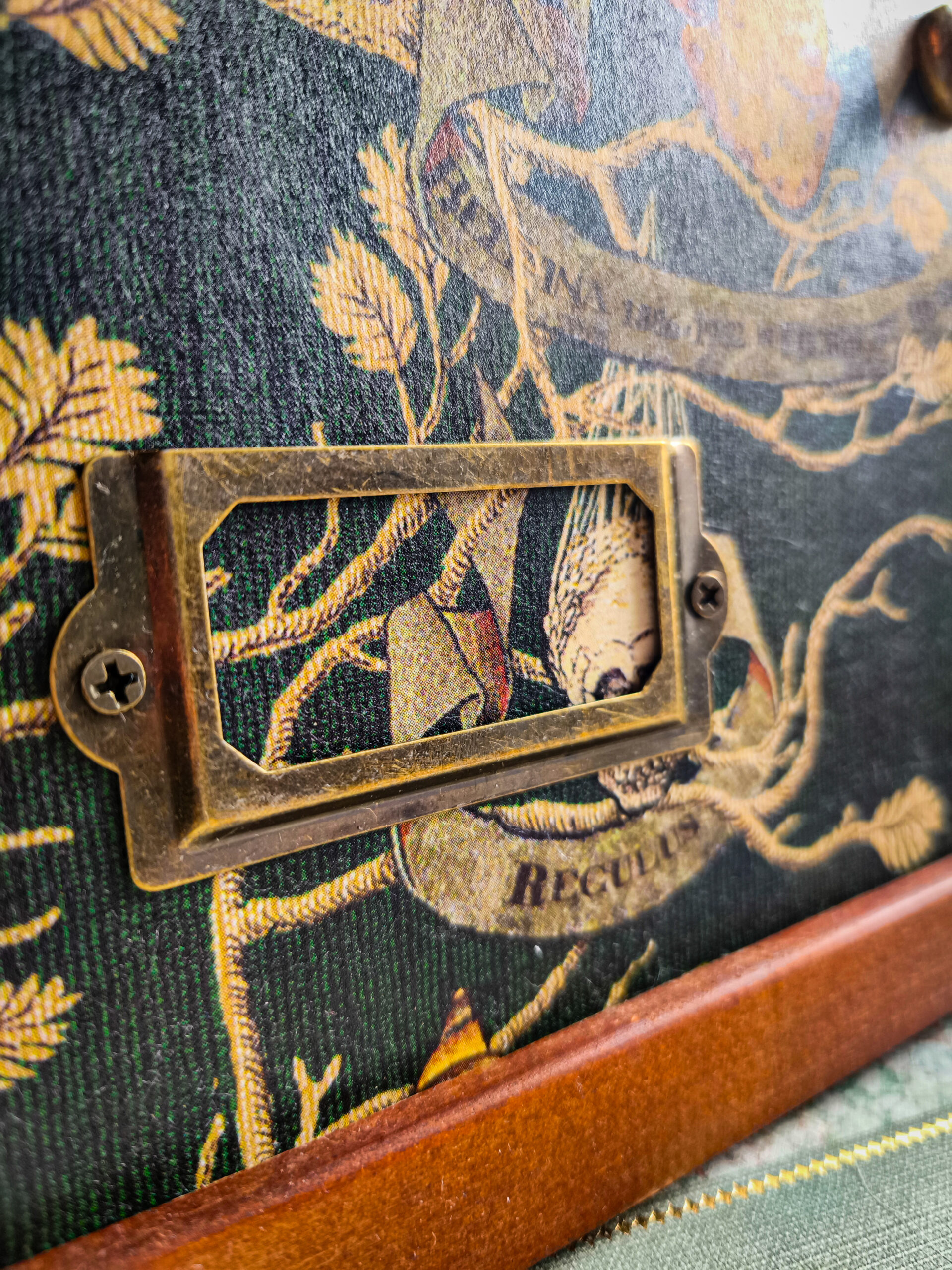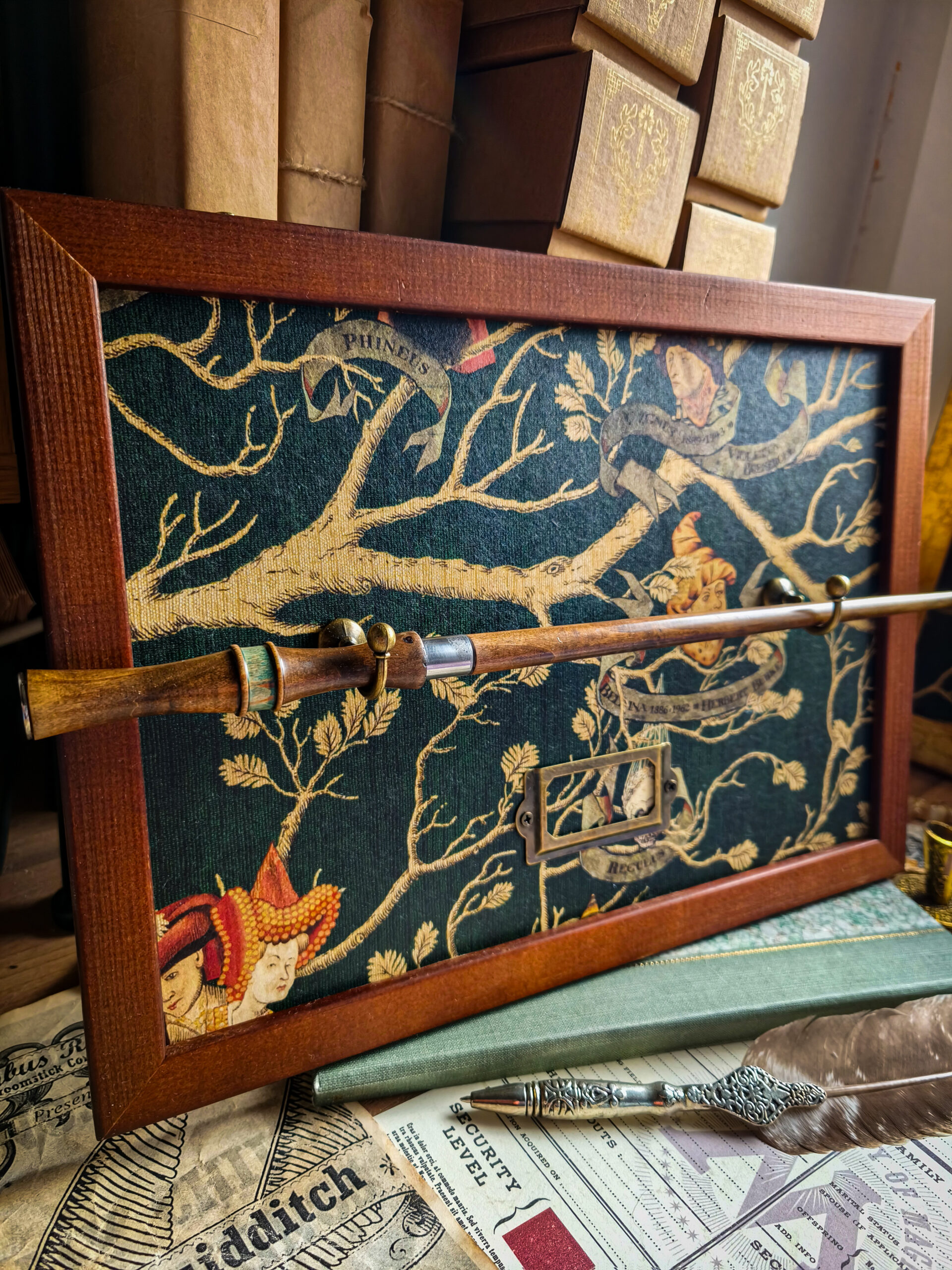Ramka pełni funkcję ekspozytora na różdżkę – idealna do prezentacji kolekcjonerskich egzemplarzy. Mosiężne haczyki utrzymują różdżkę w miejscu, a ramka na imię pozwala dodać personalizowany podpis właściciela lub nazwy różdżki. Dodatkowym atutem jest imię Regulusa tuż przy imiennej ramce.
