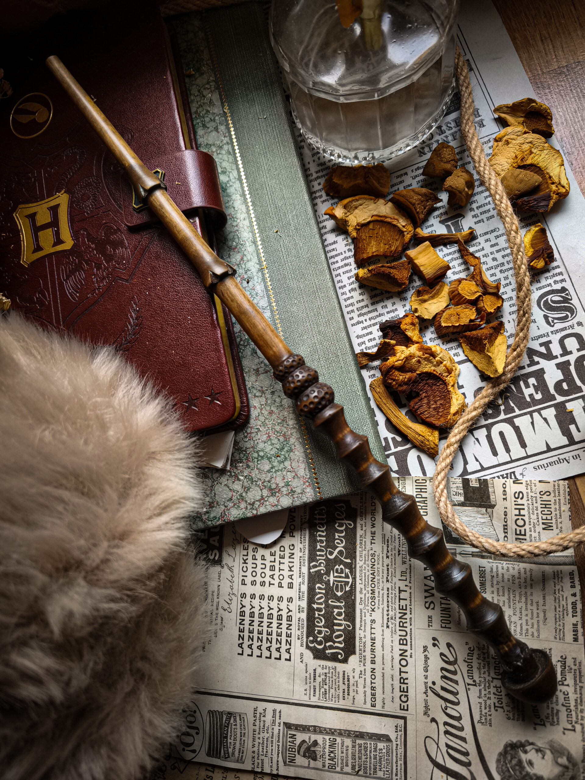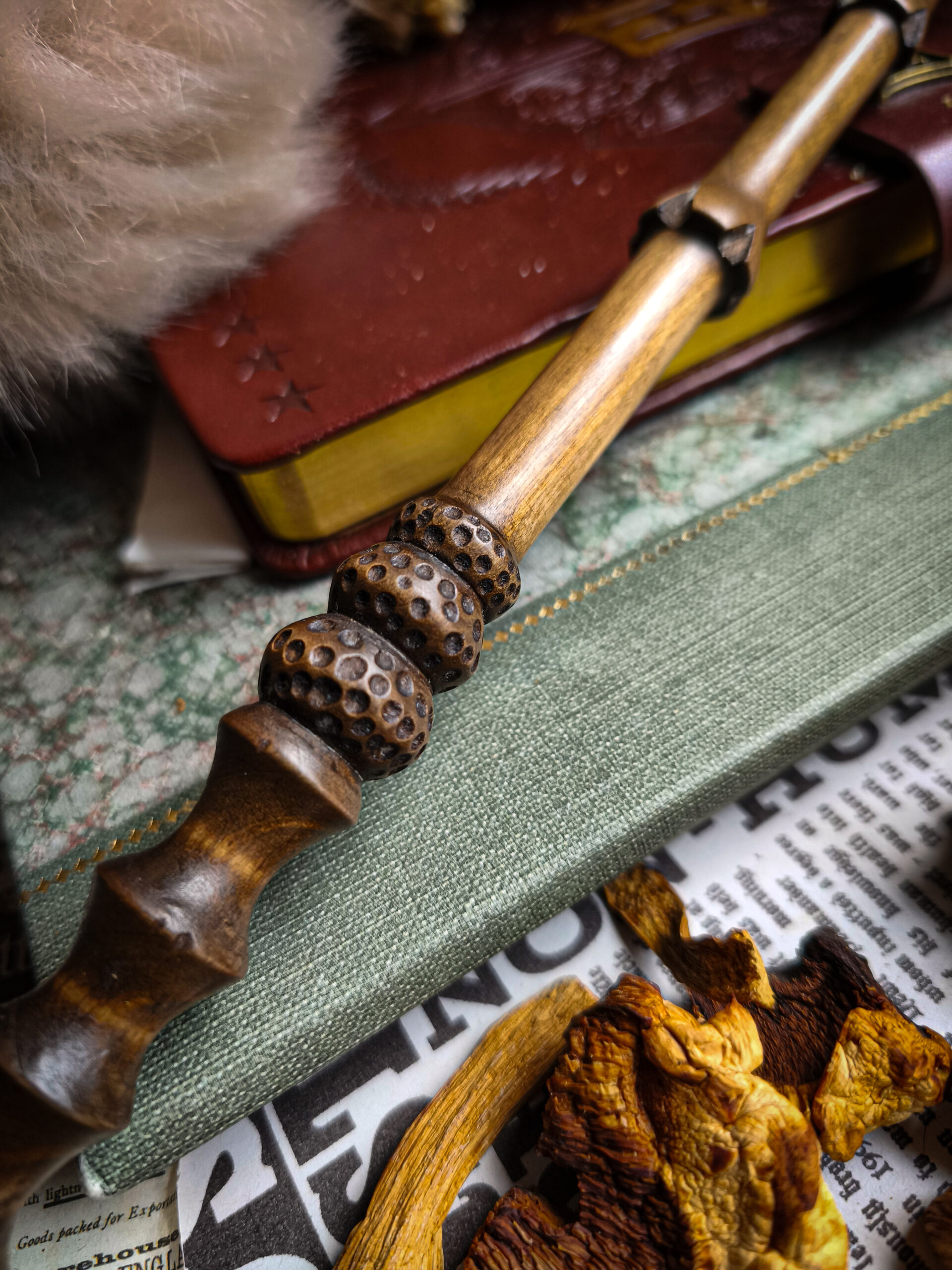 Zarówno pod kapeluszem, jak i na klindze, znajdziesz elementy stylizowane na grzybowe pierścienie — subtelne detale, które sprawiają, że ta różdżka wygląda, jakby była prosto z boru.